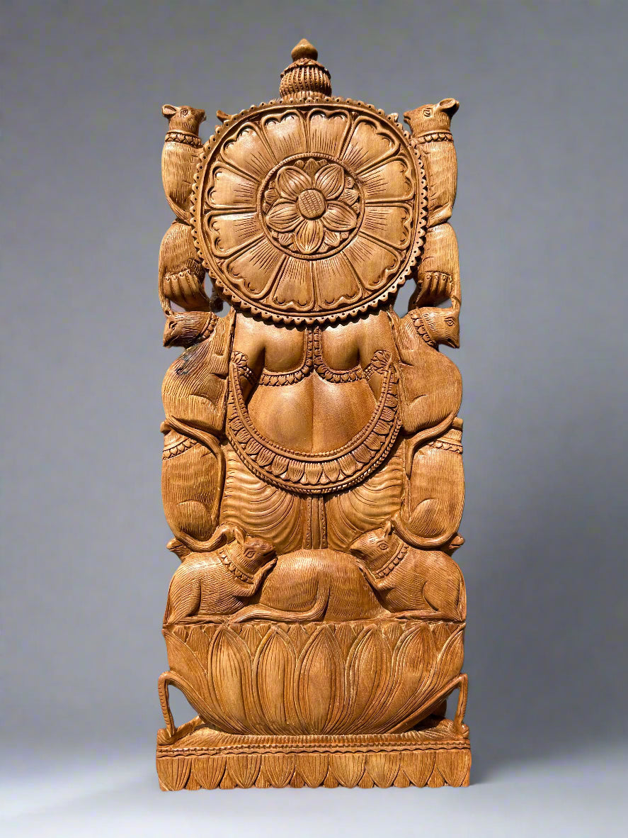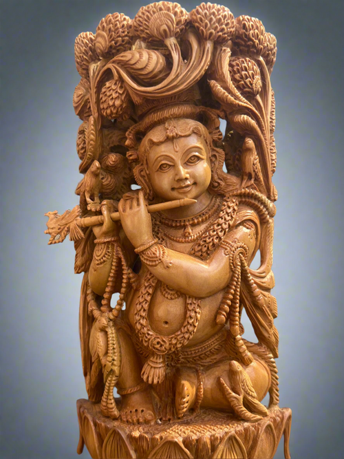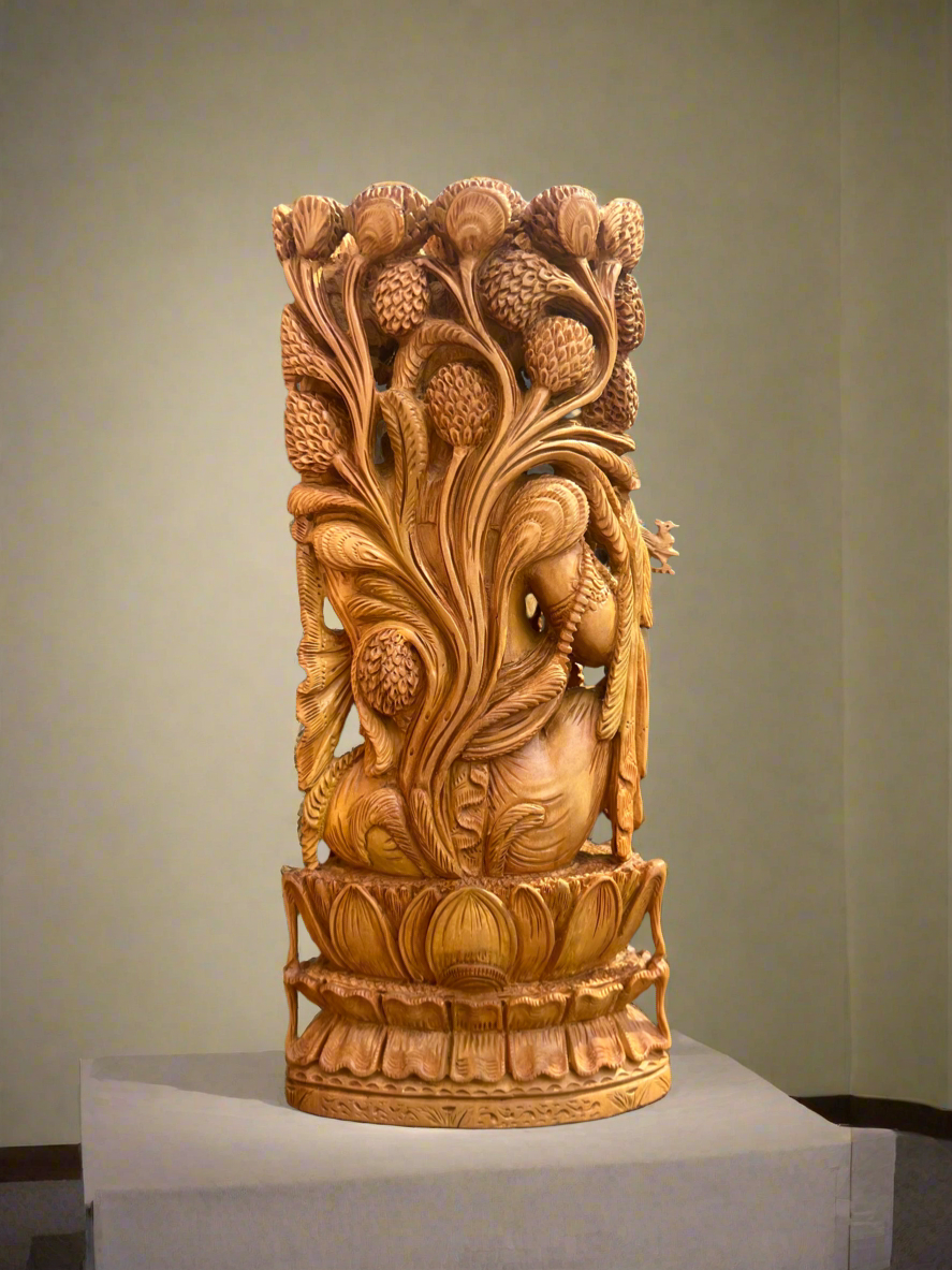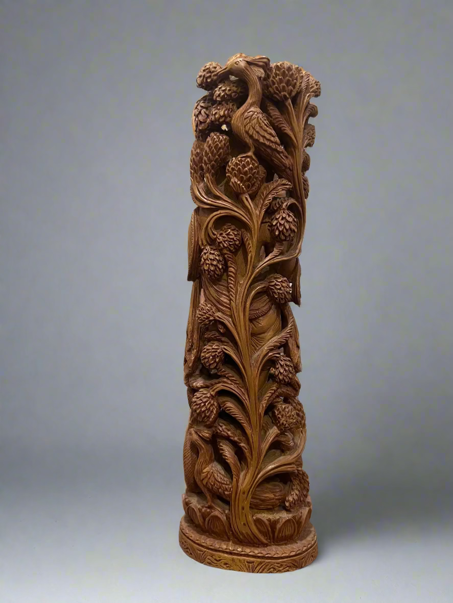 A unique replica of the Sitar (Veena), a musical instrument, crafted from pure sandalwood. This exquisite piece features carvings of Goddess Saraswati, symbolising knowledge and music, and Lord Ganesha, representing wisdom and obstacle remover. It showcases the ancient art of sandalwood carving practised in Southern India. The piece is illustrated with peacocks – the national bird of India and embellished with intricate carvings that reflect the myriad motifs from Indian culture. by Artist Mohit Jangid From Jaipur