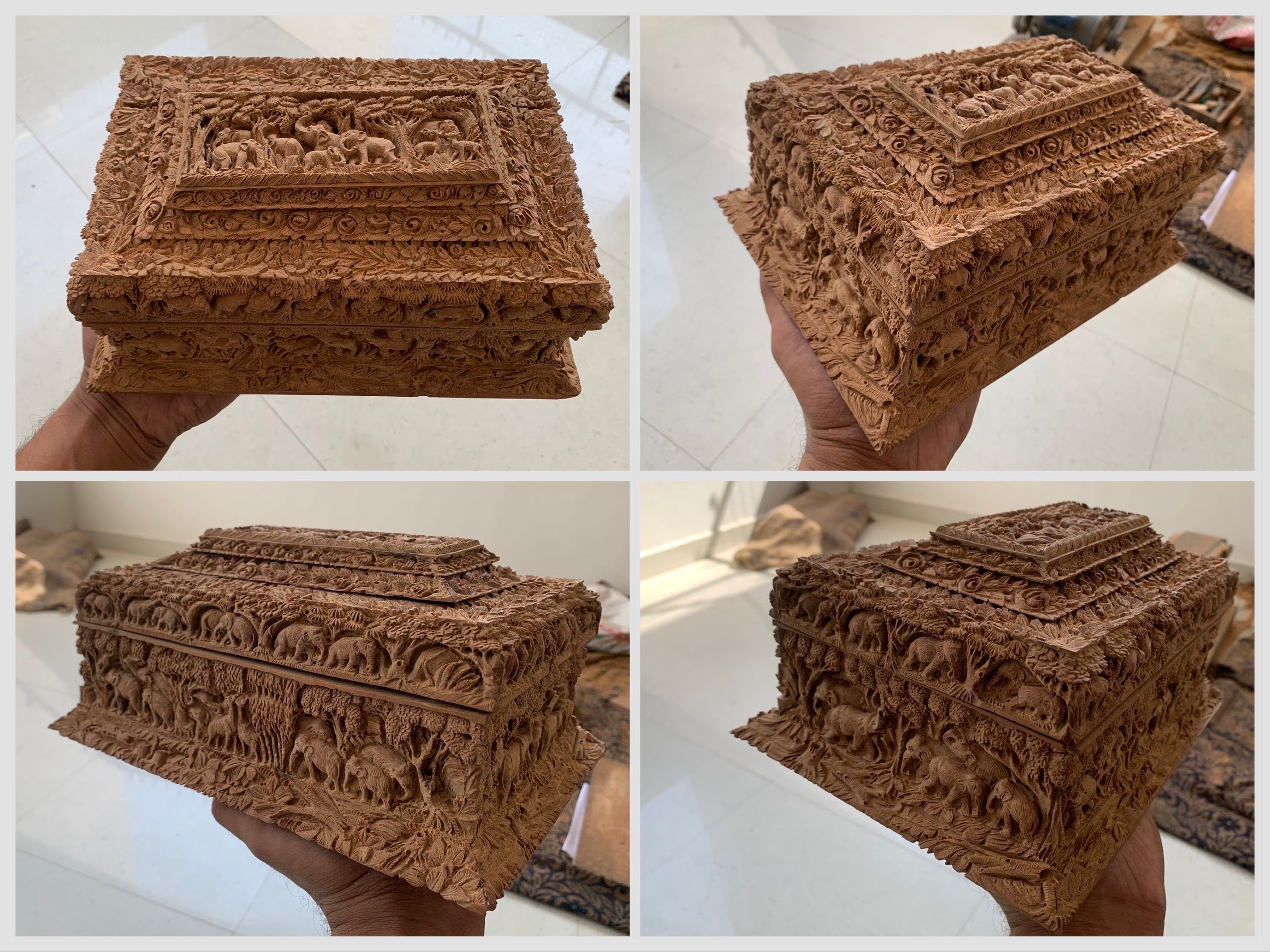 Behold the awe-inspiring Sandalwood fine carved jewelry box crafted by the renowned artisan Mohit Jangid. This masterpiece boasts a captivating elephant story that is sure to leave you spellbound.
