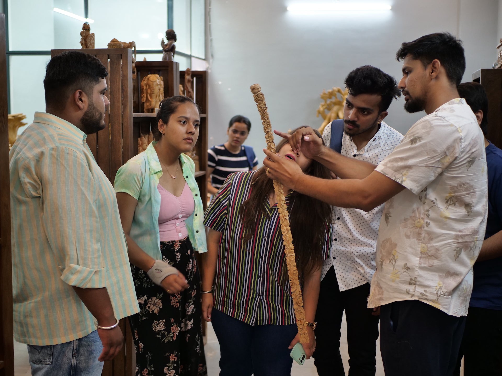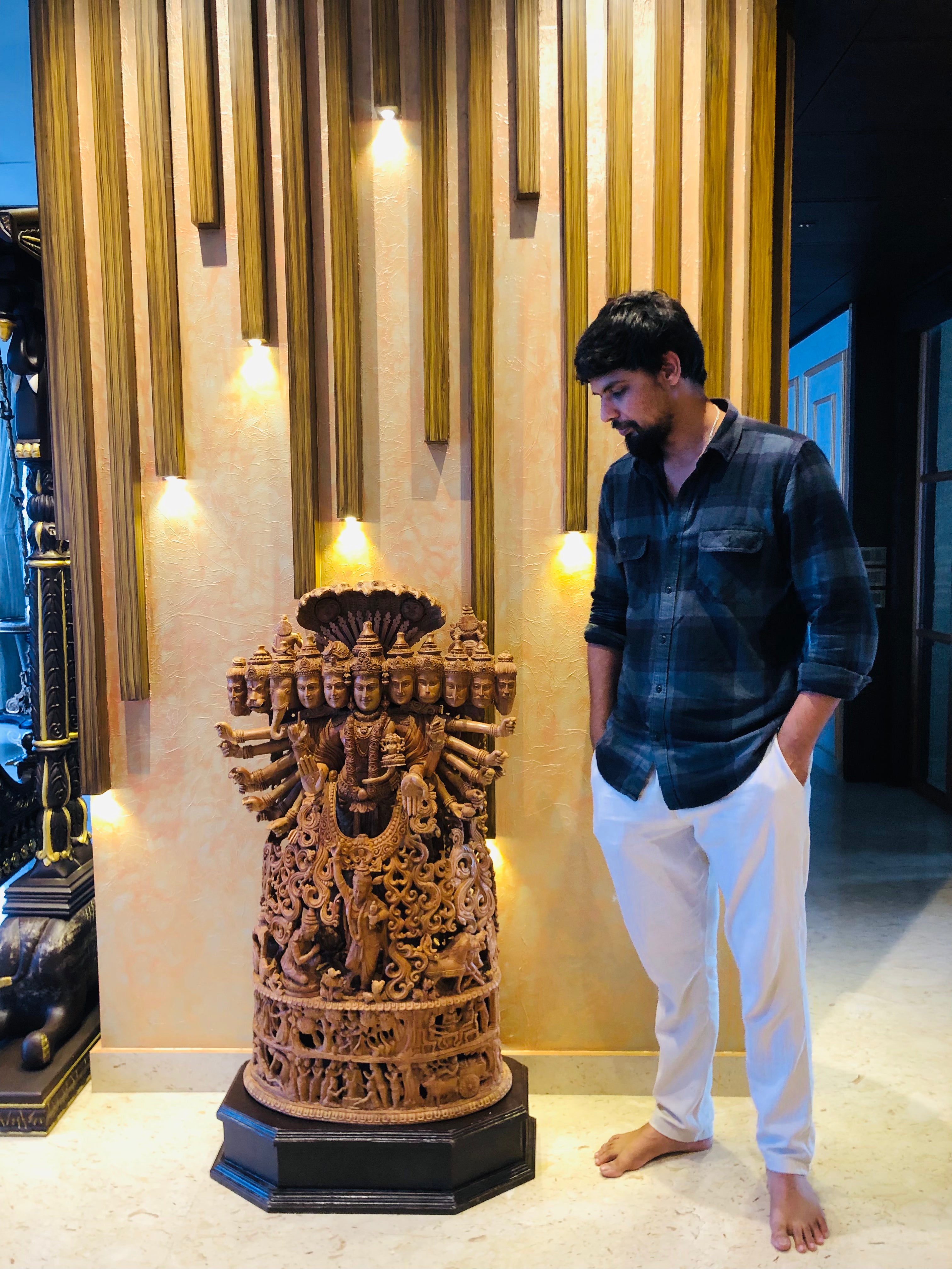 The 4 feet Vishwaroopam contains Lord Mahavishnu’s 11 faces with different expressions and related crafts. The situation which triggered the Mahabharata war is the theme of the sculpture. Based on the Customer's wish, Mohit built It using Sandal wood.